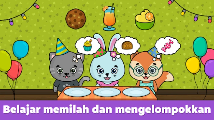 Ikut serta dalam perayaan ulang tahun Bimi Boo yang meriah! Ditemani oleh Bimi Boo dan teman-temannya, setiap permainan mini di dalam aplikasi ini dibingkai dalam skenario pesta yang ceria, menjadikan proses belajar terasa seperti bermain. Setiap interaksi dirancang khusus untuk merangsang perkembangan keterampilan vital seperti persepsi visual, kemampuan berkonsentrasi, koordinasi tangan dan mata, serta logika berpikir. Anak-anak akan secara alami melatih kemampuan mengelompokkan dan mengurutkan objek, fundamental untuk perkembangan kognitif mereka.